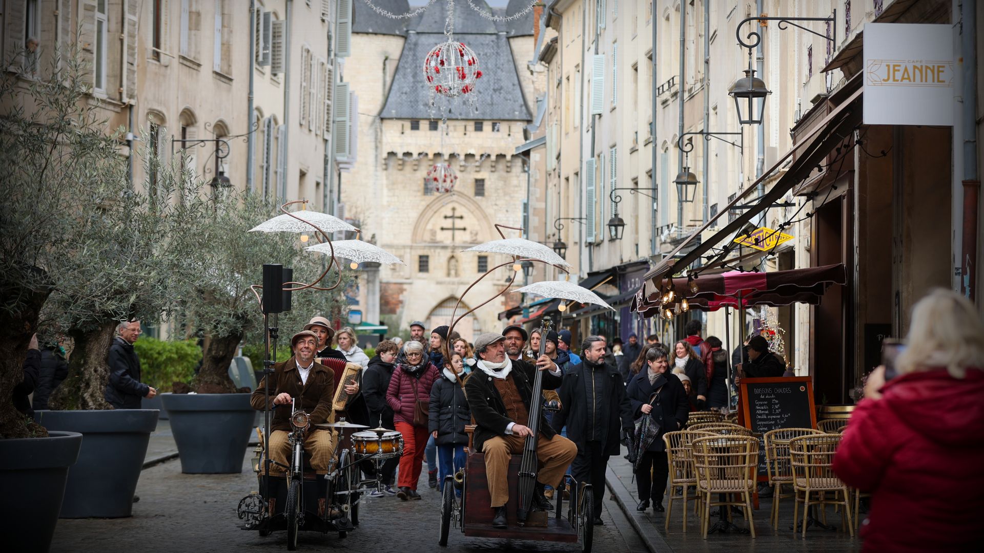 Ladies and gentlemen, get ready for a journey back in time! Tonight, the street is transformed into a 1930s film set, pulsating to the rhythm of a one-of-a-kind musical procession. Forget cars, make way for tricycles! Ingenious contraptions, lovingly recycled, criss-cross the space, transformed into veritable travelling orchestras. Their gleaming bodies, illuminated by twinkling lights, capture the sun’s energy to play lively music, a mix of swing songs and period melodies.